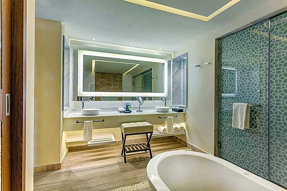 This suite features a balcony, iPod dock and bathrobe. It has Double headed Royalton Signature rain shower and In-suite Jacuzzi soaker tub. -Complimentary access with transportation to the Caribbean's largest water-park at Royalton Splash Punta Cana -Exclusive breakfast at Ocean side -Complimentary access to FlowRider the ultimate surfmachine